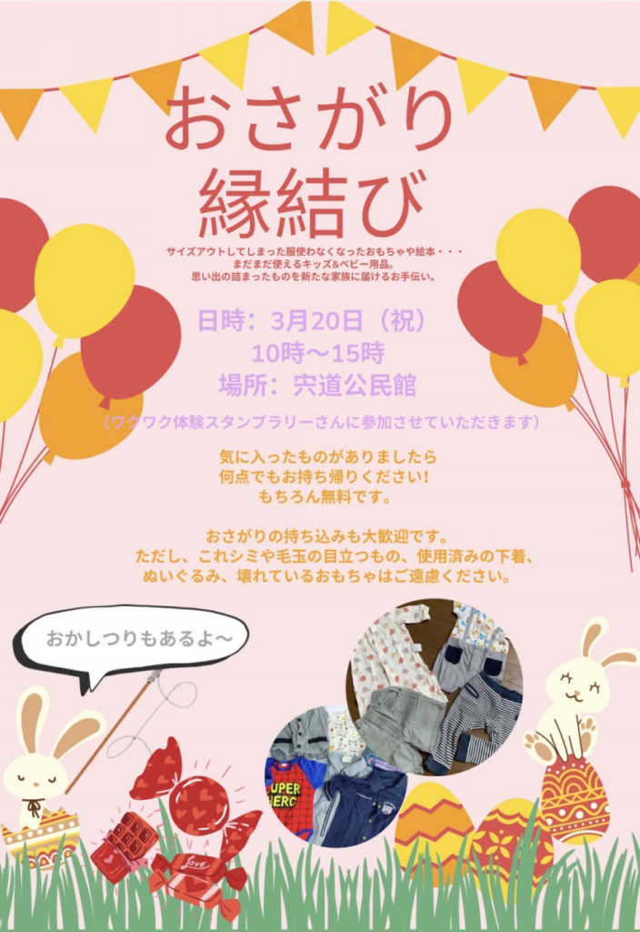 無料でベビーandキッズのお洋服やグッズをお譲りしています!!今回はセルフフォトブースや手型足形おひなさまづくり、子どもの性格診断なども企画しています!!